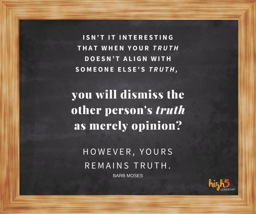 When our truth doesn’t align with someone else’s truth, it’s interesting how often we dismiss the other person’s truth as merely opinion. Yet, ours remains truth. This interaction often gets to the point where we are angry that others can’t see what is so clear to us. I asked the question in a blog a few months ago, “What if everyone is right?” What is it that makes us feel like we must be right and that everyone else should agree with us? To which, many of you are likely saying right now, “Because I AM right, Barb!”